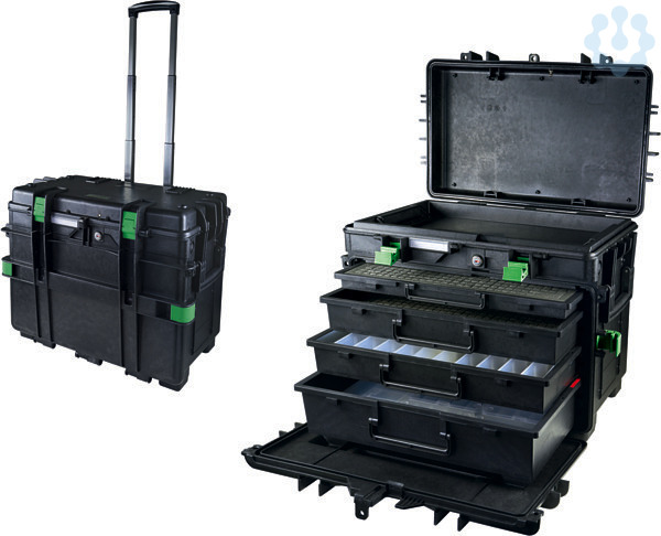 Montagekoffer ?Extreme?Hartschalenkoffer aus robustem spritzgegossenem Gehäuse aus Copolymer-Polypropylen, schwarz, mit integrierten Rollen und ausziehbarem Teleskopgriff im Kofferboden für Trolley-Funktion. Das untere Fach kann 3 bis 8 herausnehmbare Schubladen mit variabler Höhe aufnehmen, mit einer Vielzahl von optionalen inneren Konfigurationen, wie z. B. vorwürfige bicolor Schaumschichten, Behälterkästen für kleine Komponenten und sogar speziell entwickelte Werkzeugpaletten für alle Arten von Handwerkzeugen. Alle Schubladen sind im geöffneten Zustand vollständig zugänglich und verfügen über einen selbsthemmenden Anschlag, um ein versehentliches Herausfallen zu verhindern. Ein zentrales Eintastenschloss sowie ein metallverstärktes Vorhängeschloss bieten die Möglichkeit, alle Fächer mit einem einzigen Schlüssel komplett zu sichern. ? 2 seitliche Tragegriffe ? 4 robuste und geräuscharme Rollen ? Teleskopgriff für Trolley-Funktion ? Schubladensystem an der Front ? herausnehmbare Schale im oberen Fach ? Zentr