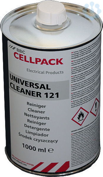 Reinigung von Maschinenteilen und Werkstoffoberflächen. Anwendungsgebiete: Abwaschen von Leitschichten, löst halbleitende Rückstände (z. B. Graphitschichten), reinigen und entfetten von Motoren und elektrischer Ausrüstung, reinigen von Kabeln und Leitungen. Eigenschaften: Verwendbar auf Neopren, Polyethylen, EPR, XLPE, PVC, Butyl-Gummi und thermoplastischen Isolationen, reinigt und entfettet ohne zu leiten und ohne Rückstände, sicher, schnell wirkend, keine Zersetzung. Lieferumfang: Reiniger UNIVERSAL CLEANER 121.