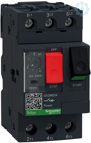 TeSys Motorschutzschalter GV2ME. Motorschutzschalter, 3P, Tasterbetätigung, Schraubanschluss. Bemessungsleistung 0,18 kW, Einstellbereich 0,40-0,63 A. Mit thermischen und magnetischen Auslösern. In der Grundausführung plombierbar und abschließbar. Betätigung über Taster, Schraubklemmen. Bemessungsspannung 400 V, nach AC-3.