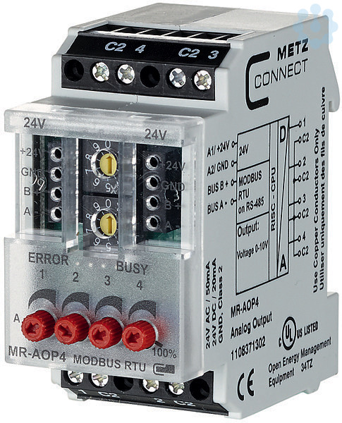 Das Modbus-Modul mit 4 analogen Ausgängen wurde für dezentrale Schaltaufgaben entwickelt. Es ist geeignet als Stellgrößengeber für z. B. elektrische Lüftungs- und Mischklappen, Ventilstellungen usw. Über einen Modbus-Master können die Ausgänge über Standard-Register ausgegeben werden. Über 4 Potentiometer auf der Frontseite kann jeder Ausgang auf Automatik- oder Manuellbetrieb eingestellt werden. Die Adressierung des Moduls, die Einstellung der Bitrate und Parität erfolgt über 2 Adressschalter auf der Frontseite oder per Software. Geeignet zur dezentralen Montage auf Tragschiene TH35 nach IEC 60715 in Elektroverteilern.Anschluss mit Schraubklemmen