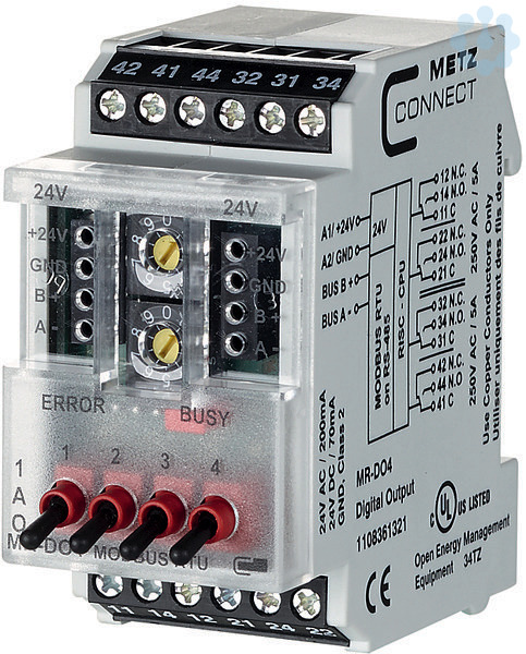 Das Modbus-Modul mit 4 digitalen Ausgängen wurde für dezentrale Schaltaufgaben entwickelt. Es ist geeignet zum Schalten elektrischer Komponenten, z. B. Motoren, Schütze, Lampen, Jalousien usw. Hierbei sind die Relaiskontakte durch geeignete lastabhängige Maßnahmen zu schützen. Das Modul verfügt über eine Handbedienebene mit der die Relais manuell geschaltet werden können. Über einen Modbus-Master können die Ausgänge über Standard-Register geschaltet werden. Die Adressierung des Moduls, die Einstellung der Bitrate und Parität erfolgt über 2 Adressschalter auf der Frontseite oder per Software. Geeignet zur dezentralen Montage auf Tragschiene TH35 nach IEC 60715 in Elektroverteilern.Anschluss mit Schraubklemmen