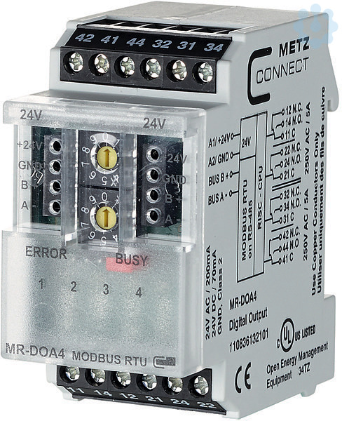 Das Modbus-Modul mit 4 digitalen Ausgängen wurde für dezentrale Schaltaufgaben entwickelt. Es ist geeignet zum Schalten elektrischer Komponenten, z. B. Motoren, Schütze, Lampen, Jalousien usw. Hierbei sind die Relaiskontakte durch geeignete lastabhängige Maßnahmen zu schützen. Das Modul verfügt über eine Handbedienebene mit der die Relais manuell geschaltet werden können. Über einen Modbus-Master können die Ausgänge über Standard-Register geschaltet werden. Die Adressierung des Moduls, die Einstellung der Bitrate und Parität erfolgt über 2 Adressschalter auf der Frontseite oder per Software. Geeignet zur dezentralen Montage auf Tragschiene TH35 nach IEC 60715 in Elektroverteilern.Anschluss mit Schraubklemmen