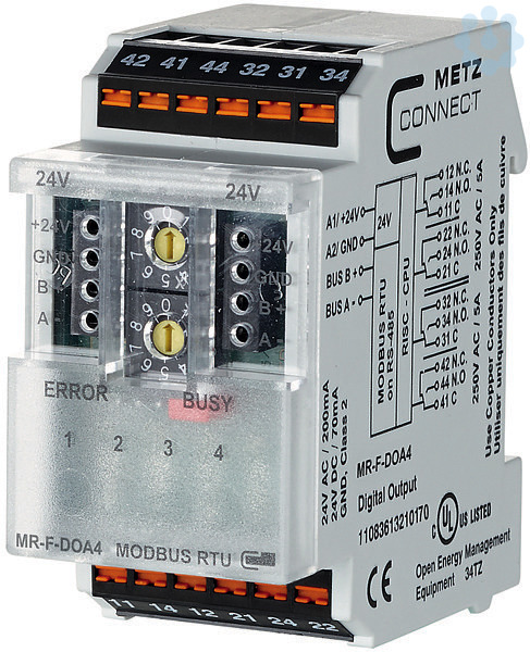 Das Modbus-Modul mit 4 digitalen Ausgängen wurde für dezentrale Schaltaufgaben entwickelt. Es ist geeignet zum Schalten elektrischer Komponenten, z. B. Motoren, Schütze, Lampen, Jalousien usw. Hierbei sind die Relaiskontakte durch geeignete lastabhängige Maßnahmen zu schützen. Das Modul verfügt über eine Handbedienebene mit der die Relais manuell geschaltet werden können. Über einen Modbus-Master können die Ausgänge über Standard-Register geschaltet werden. Die Adressierung des Moduls, die Einstellung der Bitrate und Parität erfolgt über 2 Adressschalter auf der Frontseite oder per Software. Geeignet zur dezentralen Montage auf Tragschiene TH35 nach IEC 60715 in Elektroverteilern.Anschluss mit Federkraftklemmen (Push-In)