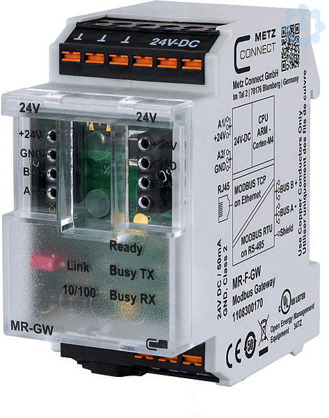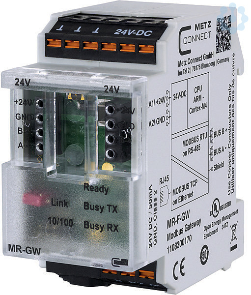 Das MR-(F)-GW ist ein kompaktes Modbus RTU / Modbus TCP Gateway. Das MR-Gateway ermöglicht einen bidirektionalen Datenaustausch zwischen Modbus RTU Feldbusgeräten und einem Modbus TCP Master (Client). Das MR-(F)-GW lässt sich in zwei Betriebsarten betreiben. Entweder als transparentes Gateway in der Betriebsart Modbus RTU over TCP oder als Protokollkonverter (Betriebsart Modbus TCP). Über zwei 4-polige Anschlussklemmen auf der Frontseite des Geräts sowie einem Brückenstecker kann das MR-Gateway an METZ CONNECT Modbus RTU Geräte angeschlossen werden. Ein integrierter Webserver dient zur Parametrierung, Verwaltung und Überwachung der beiden Schnittstellen (Ethernet / RS485). Das Webinterface wird auch zum Aktualisieren der Firmware verwendet. Das MR-Gateway ist für die dezentrale Montage in Elektrounterverteilern oder in Schaltschränken auf Tragschiene TH35 nach IEC 60715 geeignet.Gleichzeitiger Zugriff von 32 Modbus TCP Clients, Bidirektionaler Datenaustausch zwischen Modbus RTU Slave-Geräten und einem Modbus