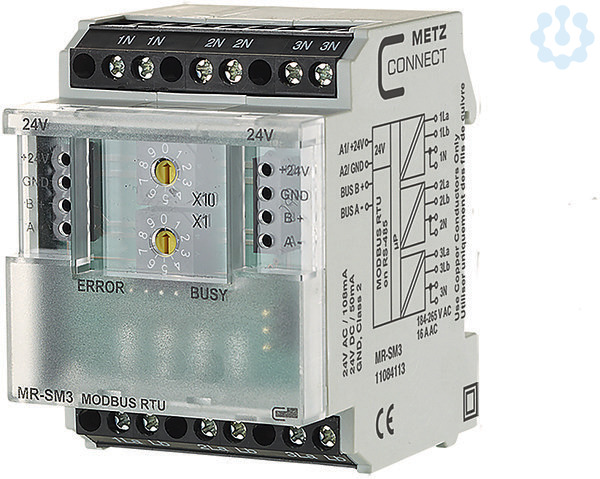 Das Modul MR-SM3 ist eine Smart-Meter-Komponente für den Einsatz in der Gebäudeautomation. Es können Strom, Spannung, Leistung und viele weitere Werte von drei 230-Volt-Stromkreisen erfasst werden. Des Weiteren werden Überwachungsfunktionen wie Asymmetrie, Phasenausfall, Phasenfolge, sowie Über- und Unterspannung zur Verfügung gestellt. Über einen Modbus-Master können die Werte abgefragt werden. Die Einstellung der Moduladresse, Bitrate und Parität erfolgt über zwei Drehschalter auf der Frontseite oder per Software. Geeignet zur dezentralen Montage auf Tragschiene TH35 nach IEC 60715 in Elektroverteilern.Anschluss mit Schraubklemmen