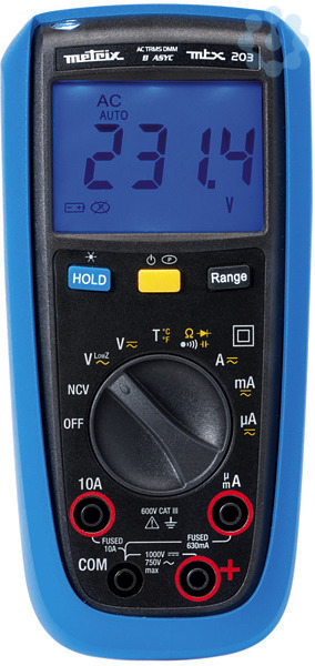 Ein kompaktes Gehäuse für alle Feldanwendungen, das in eine Hand passt und im Werkzeugkasten verstaut werden kann. Die Ummantelung ist magnetisch, sodass beim Verwenden des Multimeters die Hände zum Arbeit freibleiben. Sie können sogar in Schaltschränken eingesetzt werden. Das patentierte Multifix-System passt auf die Multimeter, dadurch kann man sie an einem Schrank oder am Gürtel anhängen, sie aufhängen usw. Der Zweifach-Standbügel bietet in jeder Stellung perfekte Ablesbarkeit. Bessere Lesbarkeit durch die blaue Hintergrundbel