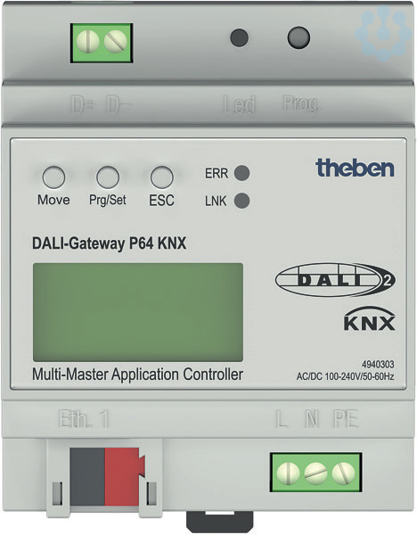 Multi-Master Application-Controller als Schnittstelle zwischen dem DALI-System und dem KNX-Bus, DALI-2 zertifiziert, Sichere Inbetriebnahme und Kommunikation durch Unterstützung von KNX Data Secure, Integration von 8 DALI-2 Sensoren (Bewegung/Präsenz und Helligkeit) gemäß EN 62386-303 und -304, Ansteuerung von 64 DALI-Teilnehmern in 16 Gruppen oder in Einzelansteuerung, Steuerung von Lichtfarbe und Farbtemperatur gemäß EN 62386-209 (DT-8) in Gruppen oder einzeln, Automatische Anpassung der Farbtemperatur an den Dimmwert, Szenenmodul für 16 Szenen (einschließlich Farbsteuerung DT8), Zeitabhängige Steuerung in Helligkeit, Lichtfarbe und Farbtemperatur, Szenenmodul für 16 Szenen (einschließlich Farbeinstellung DT8), Effektmodul für Ablaufsteuerungen, Unterstützung von Einzelbatterienotleuchten und Notleuchtensysteme mit Zentralbatterie (EN 62386-202, DT-1), LC-Display (2x 12 Zeichen) zur Menüführung bei Inbetriebnahme und Parametrierung, Inbetriebnahme über die Bedienelemente am Gerät, über den integrierten Web