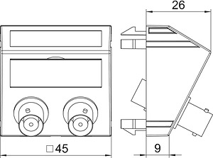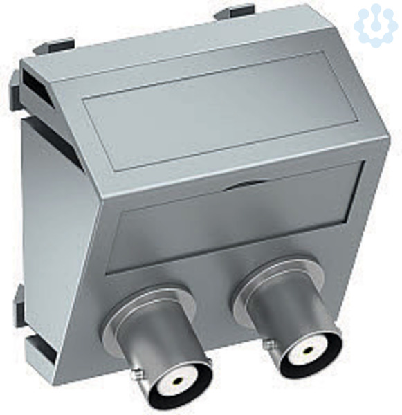 Multimediaträger mit zwei BNC Anschlussbuchsen, Kabelauslass schräg, mit Beschriftungsfeld, zwei BNC Kupplungen in Ausführung Buchse-Buchse. Trägerplatte mit Rastbefestigung, geeignet für den waagerechten und senkrechten Einbau in die Systemumgebung.
