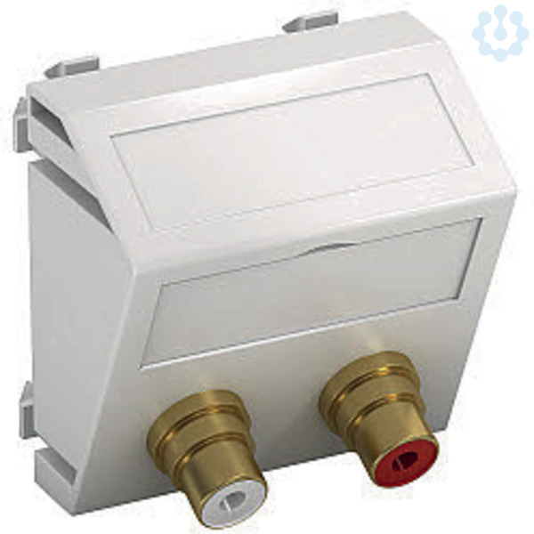 Multimediaträger mit zwei Cinch Anschlussbuchsen für Audio R / L, Kabelauslass schräg, mit Beschriftungsfeld, zwei Cinch Buchsen (RCA) mit Lötanschluss, Farbkodierung rot / weiß. Trägerplatte mit Rastbefestigung, geeignet für den waagerechten und senkrechten Einbau in die Systemumgebung.