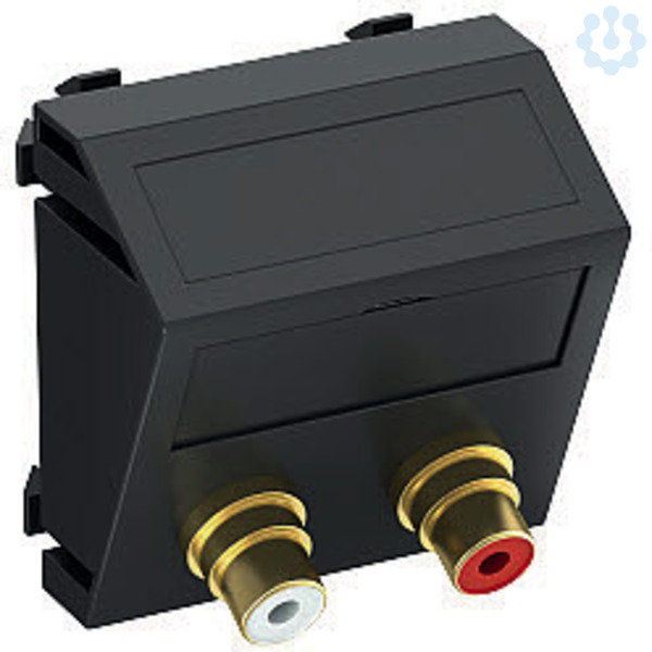 Multimediaträger mit zwei Cinch Anschlussbuchsen für Audio R / L, Kabelauslass schräg, mit Beschriftungsfeld, zwei Cinch Buchsen (RCA) mit Lötanschluss, Farbkodierung rot / weiß. Trägerplatte mit Rastbefestigung, geeignet für den waagerechten und senkrechten Einbau in die Systemumgebung.