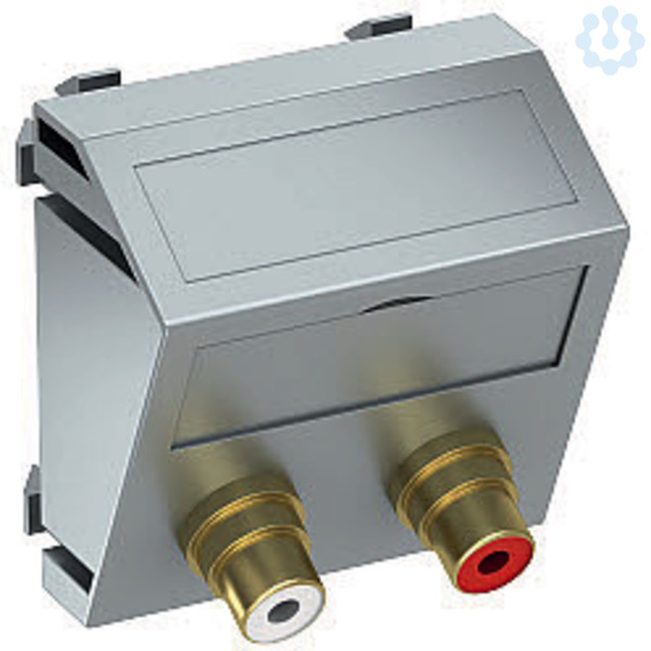 Multimediaträger mit zwei Cinch Anschlussbuchsen für Audio R / L, Kabelauslass schräg, mit Beschriftungsfeld, zwei Cinch Buchsen (RCA) mit Lötanschluss, Farbkodierung rot / weiß. Trägerplatte mit Rastbefestigung, geeignet für den waagerechten und senkrechten Einbau in die Systemumgebung.