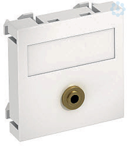 Multimediaträger mit einer Mini-Klinken Anschlussbuchse, Kabelauslass gerade, mit Beschriftungsfeld, Mini-Klinken Buchse (TRS 3,5 mm) mit Lötanschluss. Trägerplatte mit Rastbefestigung, geeignet für den waagerechten und senkrechten Einbau in die Systemumgebung.