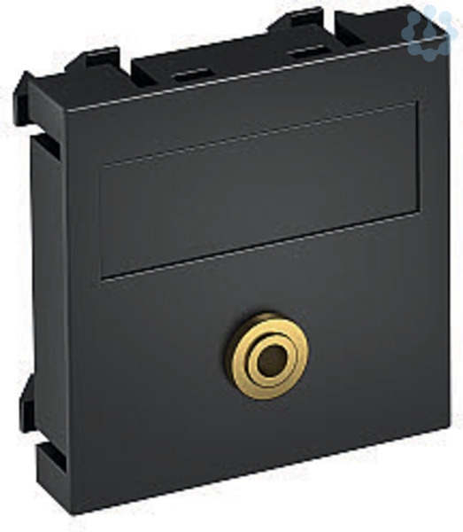 Multimediaträger mit einer Mini-Klinken Anschlussbuchse, Kabelauslass gerade, mit Beschriftungsfeld, Mini-Klinken Buchse (TRS 3,5 mm) mit Lötanschluss. Trägerplatte mit Rastbefestigung, geeignet für den waagerechten und senkrechten Einbau in die Systemumgebung.
