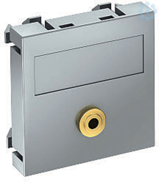 Multimediaträger mit einer Mini-Klinken Anschlussbuchse, Kabelauslass gerade, mit Beschriftungsfeld, Mini-Klinken Buchse (TRS 3,5 mm) mit Lötanschluss. Trägerplatte mit Rastbefestigung, geeignet für den waagerechten und senkrechten Einbau in die Systemumgebung.
