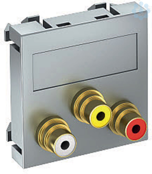 Multimediaträger mit drei Cinch Anschlussbuchsen für Audio-Video, Kabelauslass gerade, mit Beschriftungsfeld, drei Cinch Kupplungen (RCA) in Ausführung Buchse-Buchse, Farbkodierung gelb/rot/weiß. Trägerplatte mit Rastbefestigung, geeignet für den waagerechten und senkrechten Einbau in die Systemumgebung.