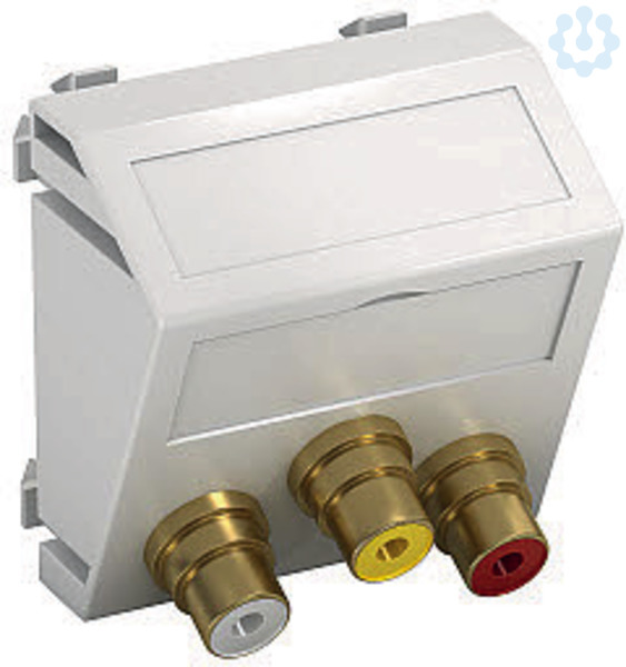 Multimediaträger mit drei Cinch Anschlussbuchsen für Audio-Video, Kabelauslass schräg, mit Beschriftungsfeld, drei Cinch Kupplungen (RCA) in Ausführung Buchse-Buchse, Farbkodierung gelb/rot/weiß. Trägerplatte mit Rastbefestigung, geeignet für den waagerechten und senkrechten Einbau in die Systemumgebung.