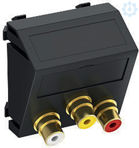 Multimediaträger mit drei Cinch Anschlussbuchsen für Audio-Video, Kabelauslass schräg, mit Beschriftungsfeld, drei Cinch Kupplungen (RCA) in Ausführung Buchse-Buchse, Farbkodierung gelb/rot/weiß. Trägerplatte mit Rastbefestigung, geeignet für den waagerechten und senkrechten Einbau in die Systemumgebung.