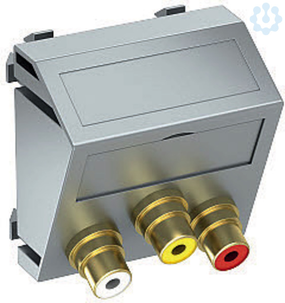 Multimediaträger mit drei Cinch Anschlussbuchsen für Audio-Video, Kabelauslass schräg, mit Beschriftungsfeld, drei Cinch Kupplungen (RCA) in Ausführung Buchse-Buchse, Farbkodierung gelb/rot/weiß. Trägerplatte mit Rastbefestigung, geeignet für den waagerechten und senkrechten Einbau in die Systemumgebung.
