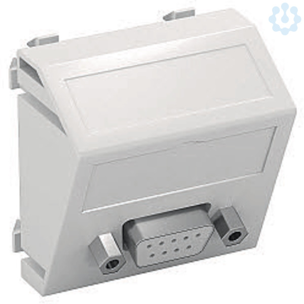 Multimediaträger mit einer D-Sub9 Anschlussbuchse, Kabelauslass schräg, mit Beschriftungsfeld, D-Sub9 Buchse (RS232) mit Schraubanschluss. Trägerplatte mit Rastbefestigung, geeignet für den waagerechten und senkrechten Einbau in die Systemumgebung.