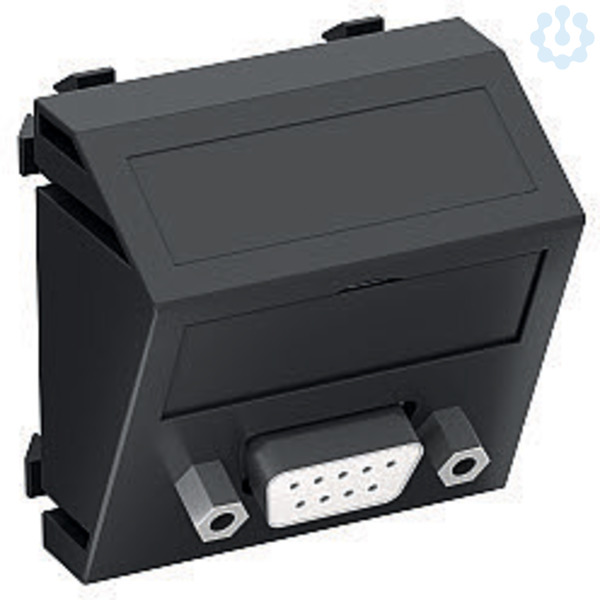 Multimediaträger mit einer D-Sub9 Anschlussbuchse, Kabelauslass schräg, mit Beschriftungsfeld, D-Sub9 Buchse (RS232) mit Schraubanschluss. Trägerplatte mit Rastbefestigung, geeignet für den waagerechten und senkrechten Einbau in die Systemumgebung.