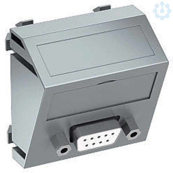 Multimediaträger mit einer D-Sub9 Anschlussbuchse, Kabelauslass schräg, mit Beschriftungsfeld, D-Sub9 Buchse (RS232) mit Schraubanschluss. Trägerplatte mit Rastbefestigung, geeignet für den waagerechten und senkrechten Einbau in die Systemumgebung.