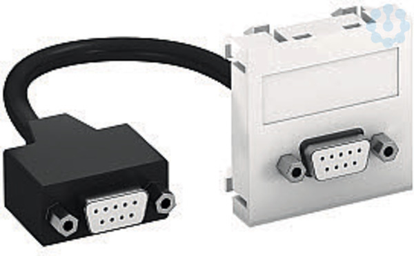 Multimediaträger mit einer D-Sub9 Anschlussbuchse, Kabelauslass gerade, mit Beschriftungsfeld, kurzes D-Sub9 Anschlusskabel (RS232) in Ausführung Buchse-Buchse. Träger mit Rastbefestigung, geeignet für den waagerechten und senkrechten Einbau in die Systemumgebung.