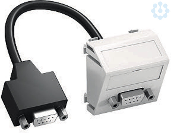 Multimediaträger mit einer D-Sub9 Anschlussbuchse, Kabelauslass schräg, mit Beschriftungsfeld, kurzes D-Sub9 Anschlusskabel (RS232) in Ausführung Buchse-Buchse. Träger mit Rastbefestigung, geeignet für den waagerechten und senkrechten Einbau in die Systemumgebung.