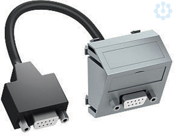 Multimediaträger mit einer D-Sub9 Anschlussbuchse, Kabelauslass schräg, mit Beschriftungsfeld, kurzes D-Sub9 Anschlusskabel (RS232) in Ausführung Buchse-Buchse. Träger mit Rastbefestigung, geeignet für den waagerechten und senkrechten Einbau in die Systemumgebung.