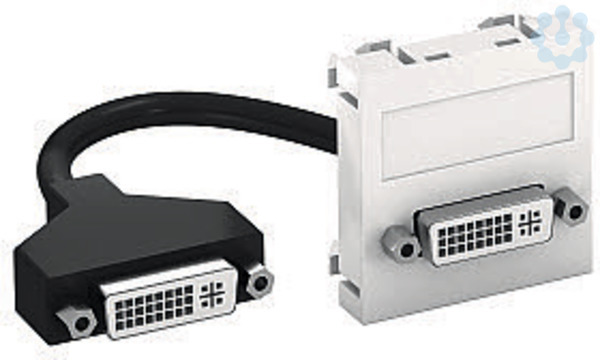 Multimediaträger mit einer DVI-I Anschlussbuchse, Kabelauslass gerade, mit Beschriftungsfeld, kurzes DVI-I Anschlusskabel in Ausführung Buchse-Buchse. Träger mit Rastbefestigung, geeignet für den waagerechten und senkrechten Einbau in die Systemumgebung.