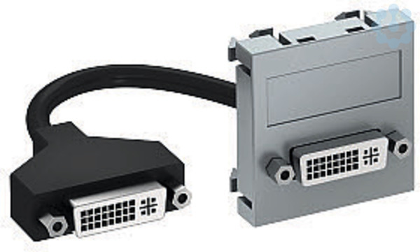 Multimediaträger mit einer DVI-I Anschlussbuchse, Kabelauslass gerade, mit Beschriftungsfeld, kurzes DVI-I Anschlusskabel in Ausführung Buchse-Buchse. Träger mit Rastbefestigung, geeignet für den waagerechten und senkrechten Einbau in die Systemumgebung.