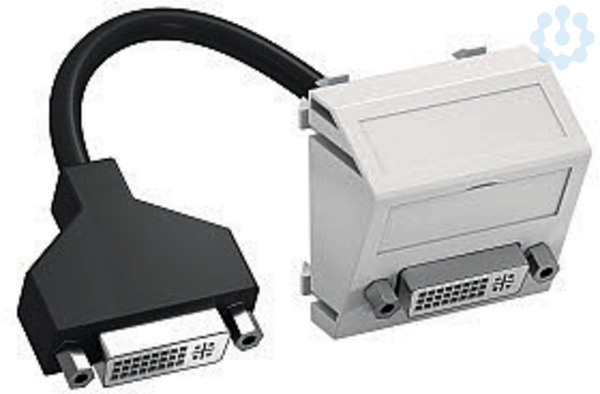 Multimediaträger mit einer DVI-I Anschlussbuchse, Kabelauslass schräg, mit Beschriftungsfeld, kurzes DVI-I Anschlusskabel in Ausführung Buchse-Buchse. Träger mit Rastbefestigung, geeignet für den waagerechten und senkrechten Einbau in die Systemumgebung.