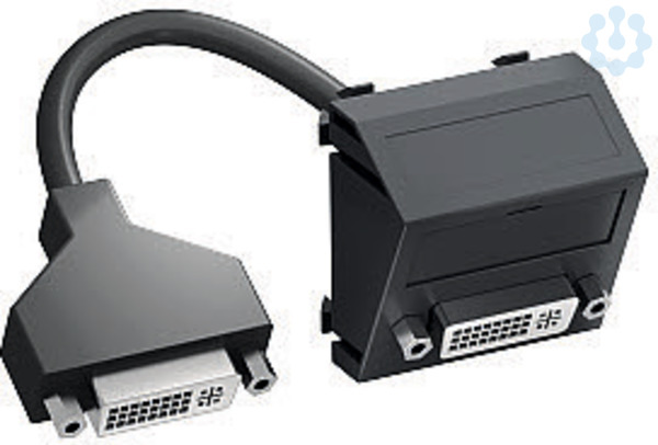 Multimediaträger mit einer DVI-I Anschlussbuchse, Kabelauslass schräg, mit Beschriftungsfeld, kurzes DVI-I Anschlusskabel in Ausführung Buchse-Buchse. Träger mit Rastbefestigung, geeignet für den waagerechten und senkrechten Einbau in die Systemumgebung.