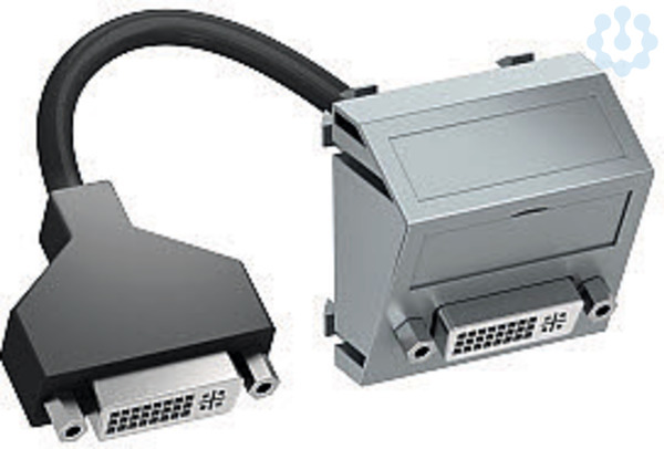 Multimediaträger mit einer DVI-I Anschlussbuchse, Kabelauslass schräg, mit Beschriftungsfeld, kurzes DVI-I Anschlusskabel in Ausführung Buchse-Buchse. Träger mit Rastbefestigung, geeignet für den waagerechten und senkrechten Einbau in die Systemumgebung.