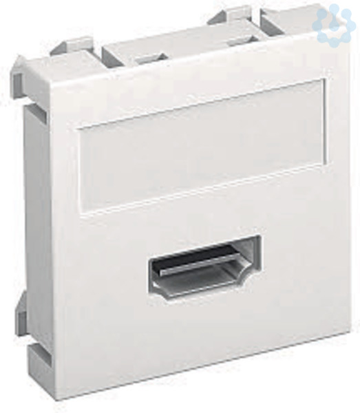 Multimediaträger mit einer HDMI Anschlussbuchse, Kabelauslass gerade, mit Beschriftungsfeld, HDMI Buchse mit Schraubanschluss. Trägerplatte mit Rastbefestigung, geeignet für den waagerechten und senkrechten Einbau in die Systemumgebung.