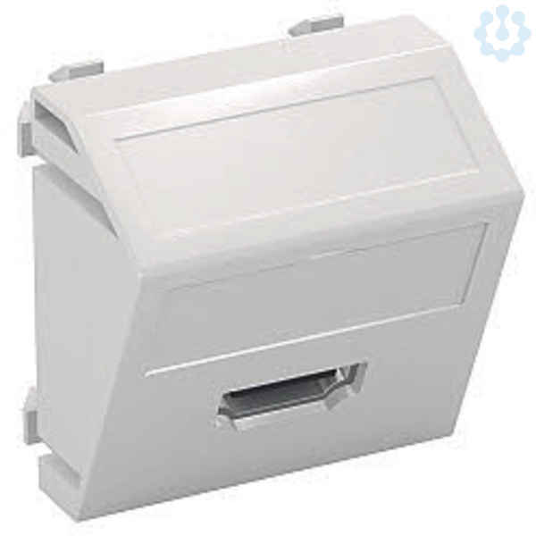 Multimediaträger mit einer HDMI Anschlussbuchse, Kabelauslass schräg, mit Beschriftungsfeld, HDMI Buchse mit Schraubanschluss. Trägerplatte mit Rastbefestigung, geeignet für den waagerechten und senkrechten Einbau in die Systemumgebung.
