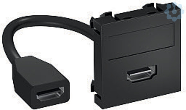 Multimediaträger mit einer HDMI Anschlussbuchse, Kabelauslass gerade, mit Beschriftungsfeld, kurzes HDMI Anschlusskabel in Ausführung Buchse-Buchse. Trägerplatte mit Rastbefestigung, geeignet für den waagerechten und senkrechten Einbau in die Systemumgebung.