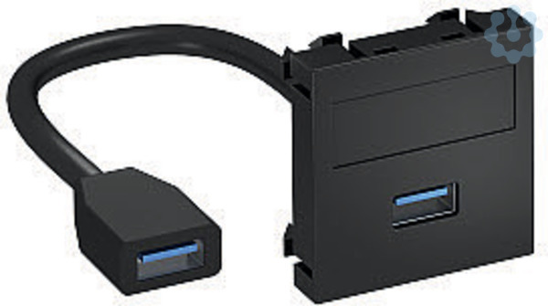 Multimediaträger mit einer USB 3.0 Anschlussbuchse, Kabelauslass gerade, mit Beschriftungsfeld, kurzes USB 3.0 Typ A Anschlusskabel in Ausführung Buchse-Buchse. Trägerplatte mit Rastbefestigung, geeignet für den waagerechten und senkrechten Einbau in die Systemumgebung.