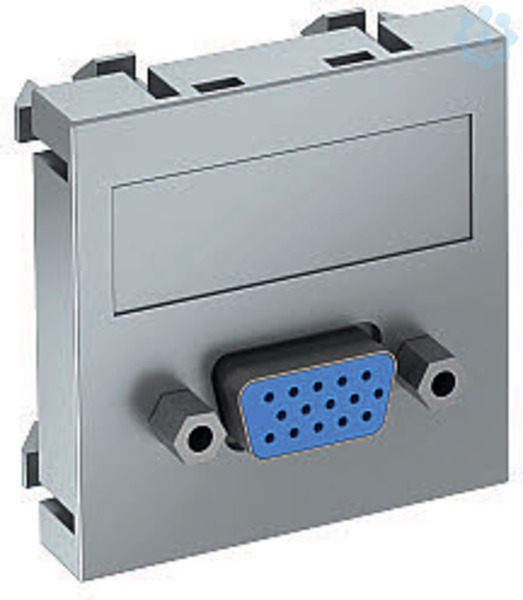 Multimediaträger mit einer VGA Anschlussbuchse, Kabelauslass gerade, mit Beschriftungsfeld, VGA Buchse (HD15) mit Schraubanschluss. Trägerplatte mit Rastbefestigung, geeignet für den waagerechten und senkrechten Einbau in die Systemumgebung.