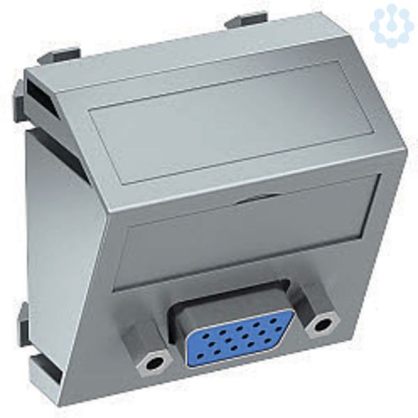 Multimediaträger mit einer VGA Anschlussbuchse, Kabelauslass schräg, mit Beschriftungsfeld, VGA Buchse (HD15) mit Schraubanschluss. Trägerplatte mit Rastbefestigung, geeignet für den waagerechten und senkrechten Einbau in die Systemumgebung.