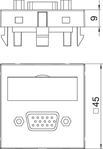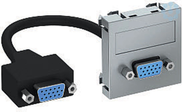 Multimediaträger mit einer VGA Anschlussbuchse, Kabelauslass gerade, mit Beschriftungsfeld, kurzes VGA Anschlusskabel (HD15) in Ausführung Buchse-Buchse. Träger mit Rastbefestigung, geeignet für den waagerechten und senkrechten Einbau in die Systemumgebung.