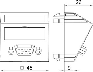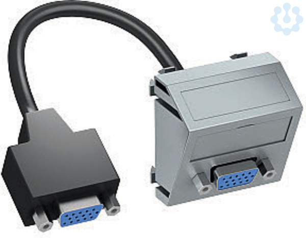 Multimediaträger mit einer VGA Anschlussbuchse, Kabelauslass schräg, mit Beschriftungsfeld, kurzes VGA Anschlusskabel (HD15) in Ausführung Buchse-Buchse. Träger mit Rastbefestigung, geeignet für den waagerechten und senkrechten Einbau in die Systemumgebung.