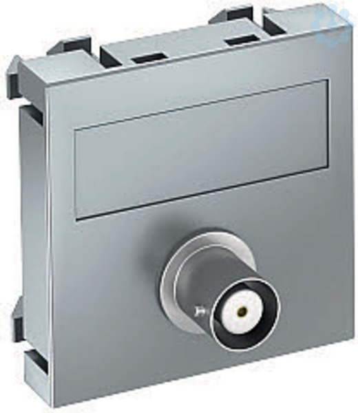 Multimediaträger mit einer BNC Anschlussbuchse, Kabelauslass gerade, mit Beschriftungsfeld, BNC Kupplung in Ausführung Buchse-Buchse. Trägerplatte mit Rastbefestigung, geeignet für den waagerechten und senkrechten Einbau in die Systemumgebung.
