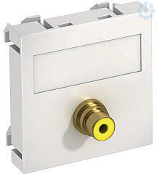 Multimediaträger mit einer Cinch Anschlussbuchse für Composite Video, Kabelauslass gerade, mit Beschriftungsfeld, Cinch Kupplung (RCA) in Ausführung Buchse-Buchse, Farbkodierung gelb. Trägerplatte mit Rastbefestigung, geeignet für den waagerechten und senkrechten Einbau in die Systemumgebung.