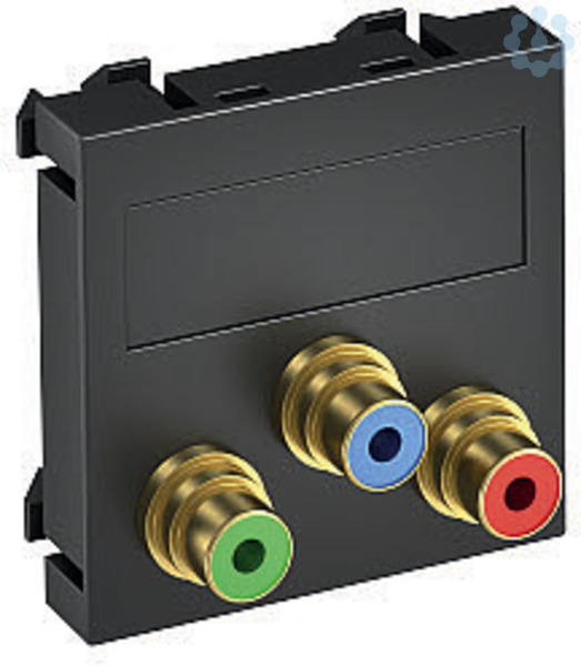 Multimediaträger mit drei Cinch Anschlussbuchsen für Component Video, Kabelauslass gerade, mit Beschriftungsfeld, drei Cinch Kupplungen (RCA) in Ausführung Buchse-Buchse, Farbkodierung rot / grün / blau. Trägerplatte mit Rastbefestigung, geeignet für den waagerechten und senkrechten Einbau in die Systemumgebung.