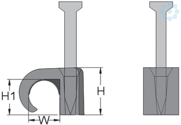 Nagelschellen für Rundkabelzur Befestigung und Fixierung elektrischer Leitungen, optimale Krallenform für sicheren Halt der Leitung, fixierbar am Kabel, Ausführung mit eingestecktem verzinkten Nagel, Material: schlagfestes Polyethylen (PE), halogenfrei, Temperaturbeständigkeit: -40 °C bis +80°C, kurzfristig bis ca. 100 °C. NL=Nagellänge N-Ø=Nageldurchmesser H=Höhe H1= Höhe 1 W= Weite (Öffnung)