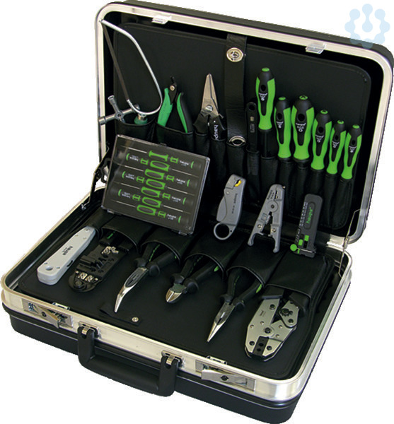 Netzwerk-ServicekofferHartschalenkoffer, schwarz, abschließbar, für den Elektriker und Netzwerkprofi, 2 Werkzeugtafeln, eine davon mit Dokumententasche, Bodenschale mit 8 herausnehmbaren Kleinkästen, transportsicher abgedeckt. Koffer 220073.Inhalt: ? 2K-Elektriker-Schraubendreher 2,5 x 75, 4 x 100, 5 x 150 mm ? 2K-Schraubendreher PH 0, 1 + 2 ? Schaltschrankschlüssel ? Präzisionsabisolierer 0,25 - 0,8 mm2 ? Universalschere 190 mm ? PUK-Säge mit festem Griff ? 2K-Seitenschneider 160 mm ? 2K-Telefonzange 200 mm ? 2K-Telefonzange 200 mm, gebogen 45° ? Crimpzange Koaxverbinder ? ESD-Elektronik-Seitenschneider 115 mm ? Abisolierer Koaxialkabel ? VDE/GS Spannungsprüfer 125 - 250 V ? Elektronik-Schraub.-Satz, 7-teilig ? Abisolierer für UTP-/STP-Datenkabel ? Crimpzange für Westernstecker ? Sensor-Anlegewerkzeug