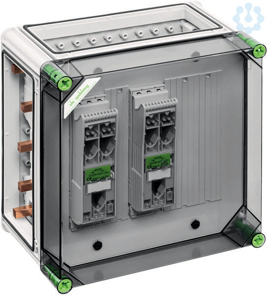 NH-Reiter-Sicherungs-Lasttrennschaltergehäuse, Industrie Qualität, 2 x NH 000-Reiter-Sicherungs-Lasttrennschalter, Fahrstuhlklemme 1,5-50mm², Abgang unten, auf Sammelschiene 5-polig, mit 5 Sammelschienenklemmen zum direkten Anschluss eines Kabels an das Sammelschienensystem, zusätzliche N- und PE-Klemme für jeden Trennschalter, 3 x Gehäuseverbinder (GGV), Sammelschienensystem 250 A, mit transparentem DeckelAbmessungen: 320 x 320 x 179mm