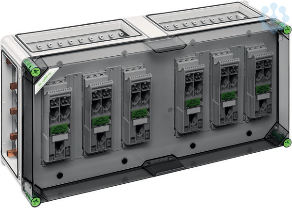 NH-Reiter-Sicherungs-Lasttrennschaltergehäuse, Industrie Qualität, 6 x NH 000-Reiter-Sicherungs-Lasttrennschalter, Fahrstuhlklemme 1,5-50mm², Abgang unten, auf Sammelschiene 5-polig, mit 5 Sammelschienenklemmen zum direkten Anschluss eines Kabels an das Sammelschienensystem, zusätzliche N- und PE-Klemme für jeden Trennschalter, 4 x Gehäuseverbinder (GGV), Sammelschienensystem 250 A, mit transparentem DeckelAbmessungen: 640 x 320 x 179mm