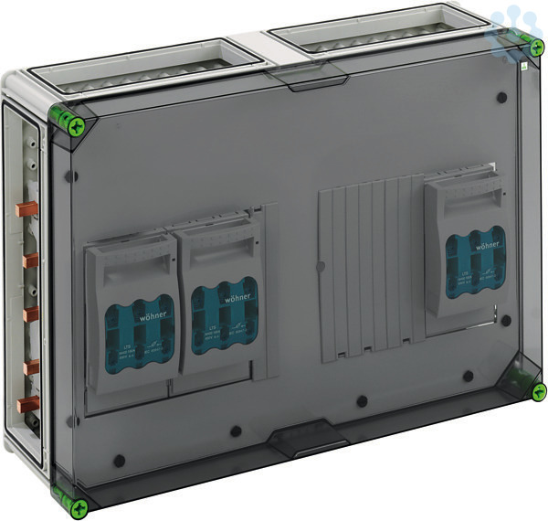 NH-Reiter-Sicherungs-Lasttrennschaltergehäuse mit zusätzlichem Anschlussraum, Industrie Qualität, 3 x NH 00-Reiter-Sicherungs-Lasttrennschalter, Bemessungsstrom 125 A, Schellenanschluss 1,5-70qmm, Abgang oben, auf Sammelschiene 5-polig, mit 5 Sammelschienenklemmen 16-70qmm, N-Klemmen 4-35qmm, PE-Klemmen 4-35qmm, 4 x Gehäuseverbinder (GGV), auf Sammelschienensystem 250 A, mit transparentem Deckel