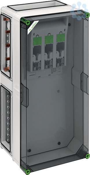 NH-Reiter-Sicherungs-Lasttrennschaltergehäuse, Industrie Qualität, 1 x NH 1-Reiter-Sicherungs-Lasttrennschalter, Schraubanschluss M10, Abgang unten, auf Sammelschiene 5-polig, N-Klemme 16-120qmm, PE-Klemme 16-120qmm, 4 x Gehäuseverbinder (GGV), auf Sammelschienensystem 630 A, mit transparentem Deckel